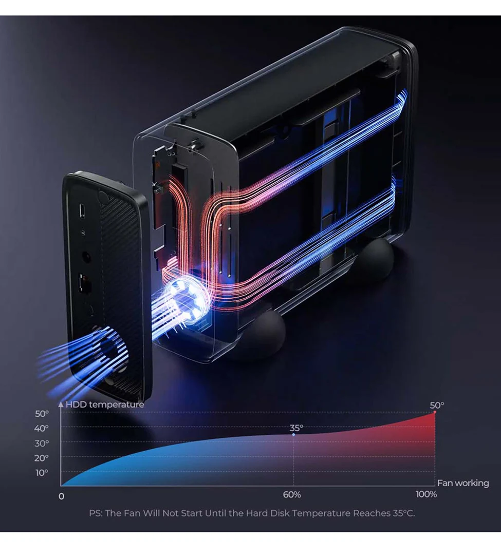 An aluminum Alloy Chassis with a built-in high-speed low-noise fan efficiently dissipates heat from the hard drive.